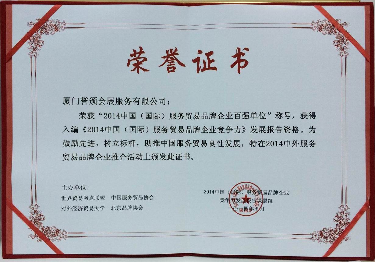 譽(yù)頒會(huì)展榮獲“2014中國(guó)(國(guó)際)服務(wù)貿(mào)易品牌企業(yè)百?gòu)?qiáng)單位”稱(chēng)號(hào),獲得入編《2014中國(guó)(國(guó)際)服務(wù)貿(mào)易品牌企業(yè)競(jìng)爭(zhēng)力》發(fā)展報(bào)告資格。特在2014中外服務(wù)貿(mào)易品牌企業(yè)推薦活動(dòng)上頒發(fā)榮譽(yù)證書(shū)。